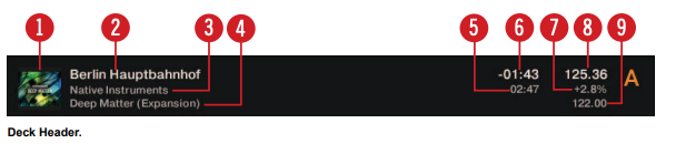 The Deck Header displays information about the loaded track, Remix Set, or STEM File such as the artist name, track title and tempo. The displayed information can be customized in the Preferences.