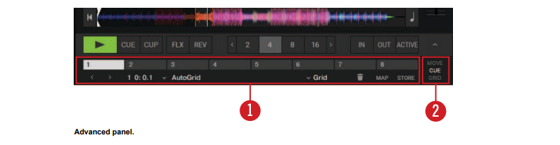 On the Track Deck and on the STEM Deck, the Advanced panel contains advanced control options for Cue Point and Loop management, and for correcting the Beatgrids for your tracks. On the Remix Deck, the Advanced panel gives you access to the parameter settings of the individual Sample Cells.