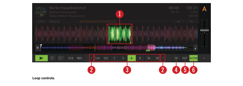 (4) Loop In button: Sets the start point for the Loop. TRAKTOR Overview 30